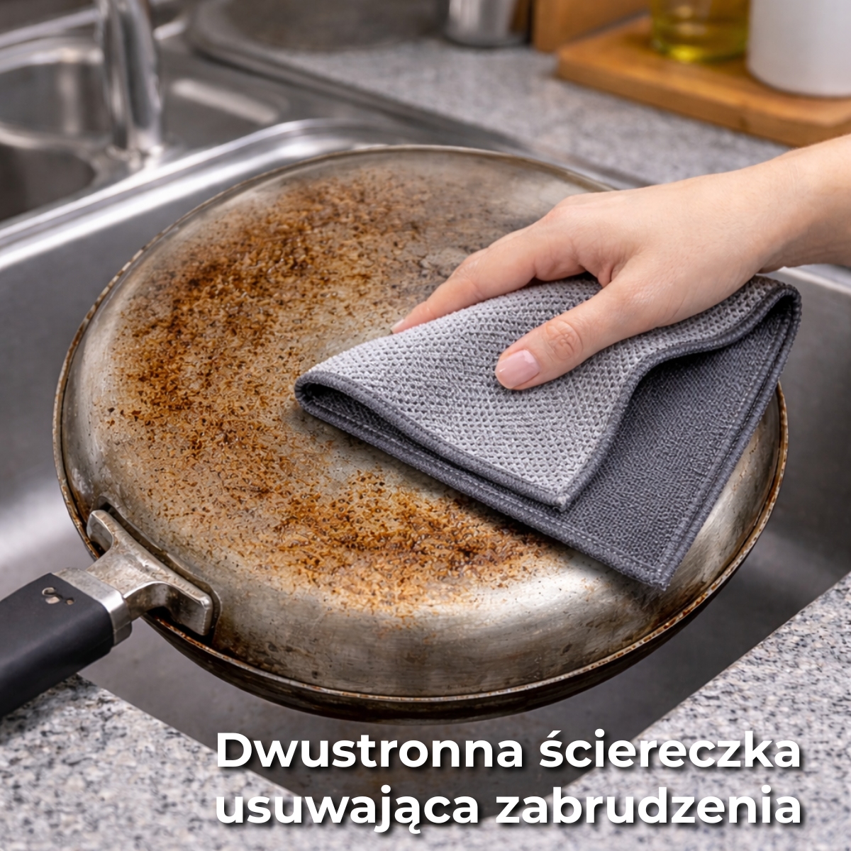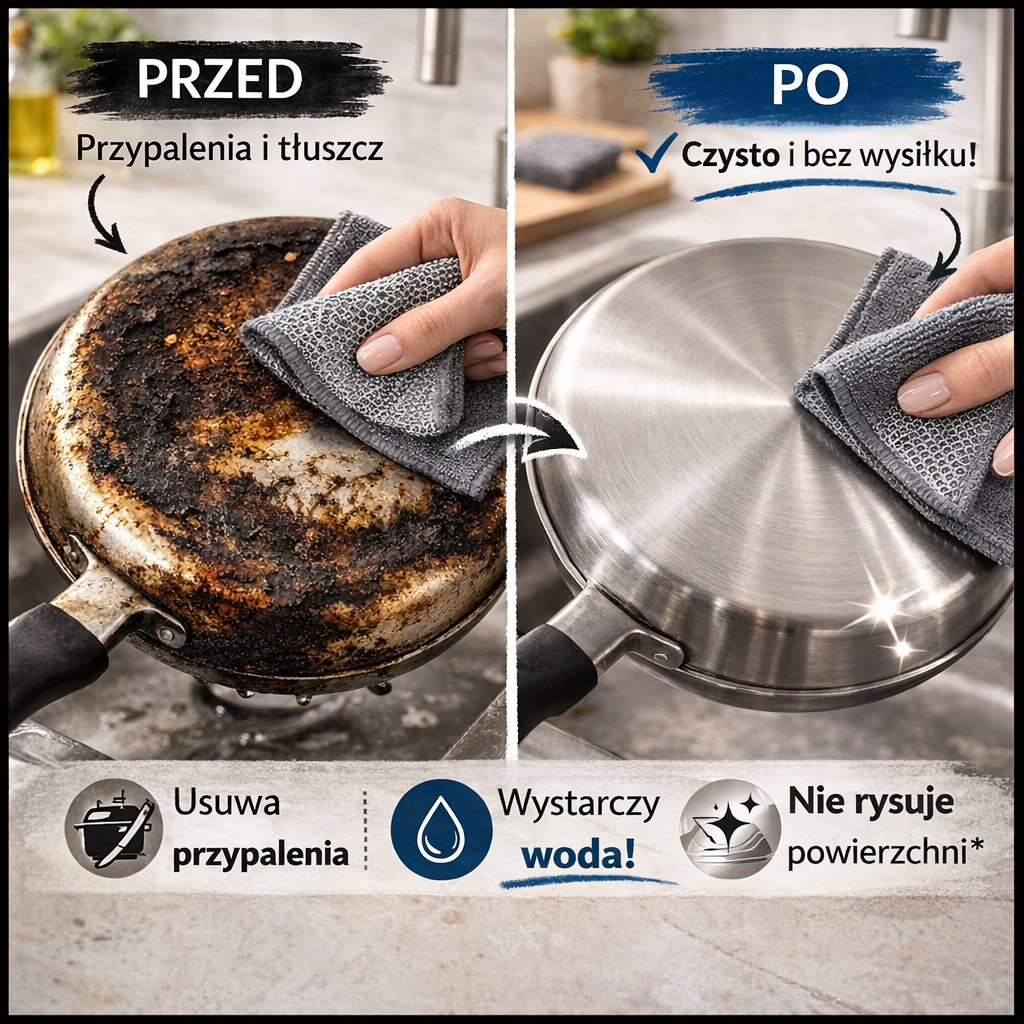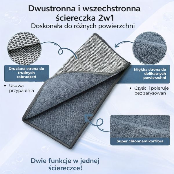 Przypalony garnek? Zaschnięty tłuszcz? Teraz poradzisz sobie z nimi w kilka chwil. Dwustronna ściereczka 2w1 została stworzona po to, by skrócić czas sprzątania i zwiększyć skuteczność czyszczenia — bez godzin spędzonych przy zlewie.