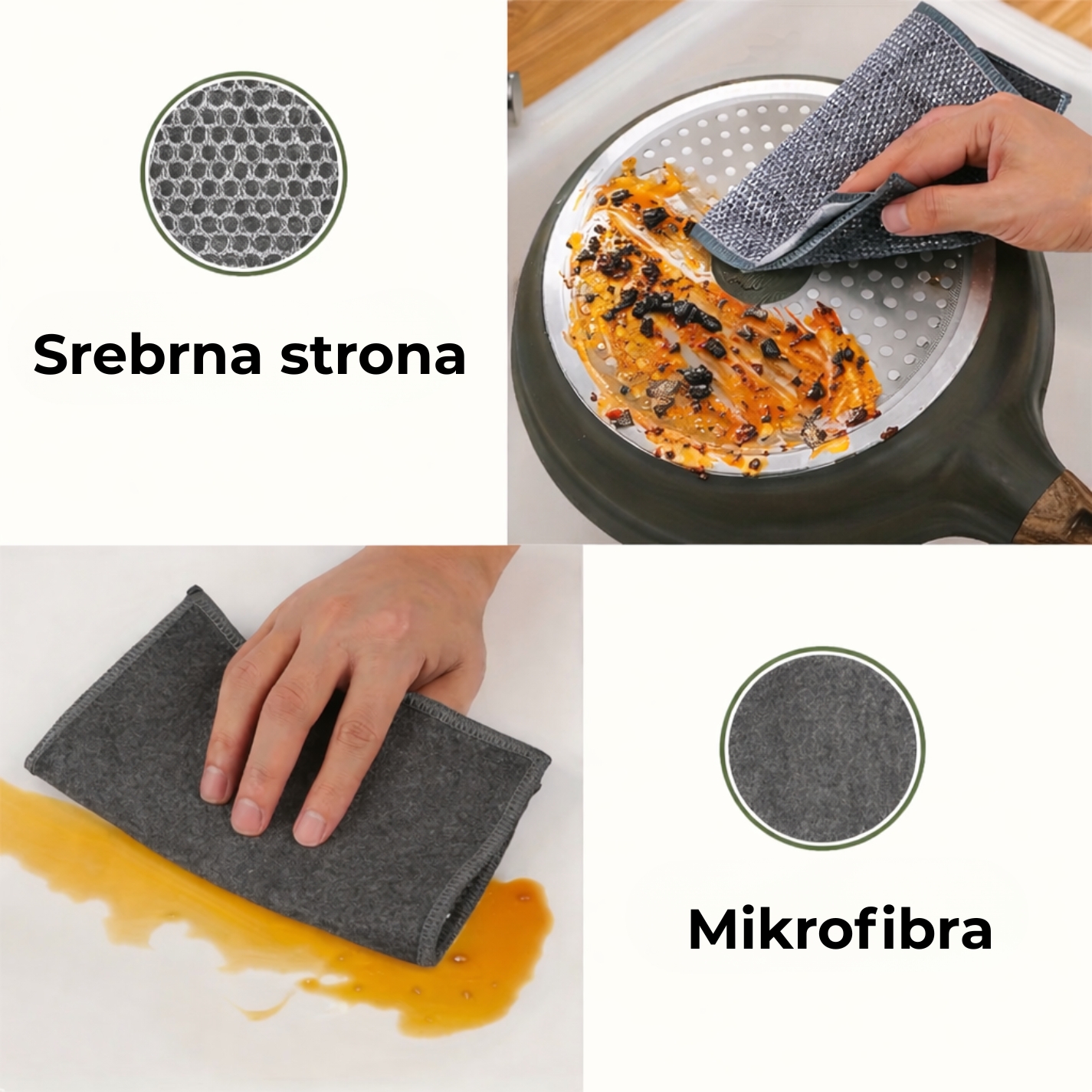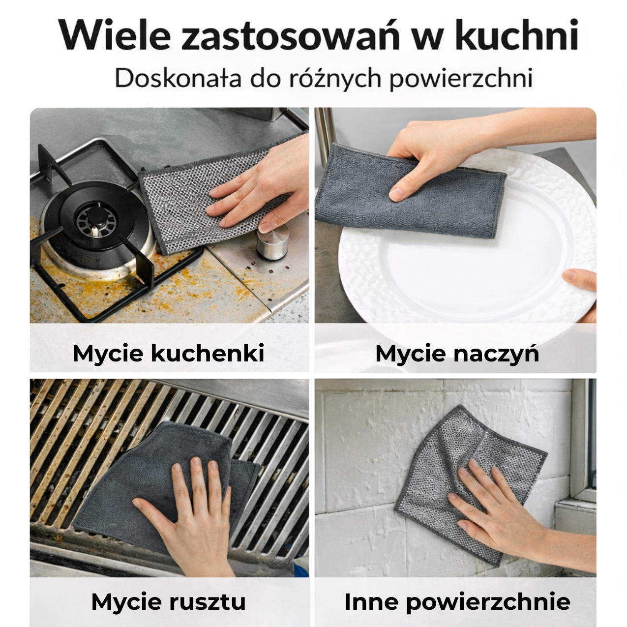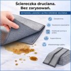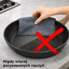 Ściereczka skutecznie usuwa tłuszcz, resztki jedzenia i przypalenia, pozostawiając naczynia idealnie czyste. Sprawdza się zarówno przy codziennym myciu, jak i przy gruntownym czyszczeniu kuchni.
